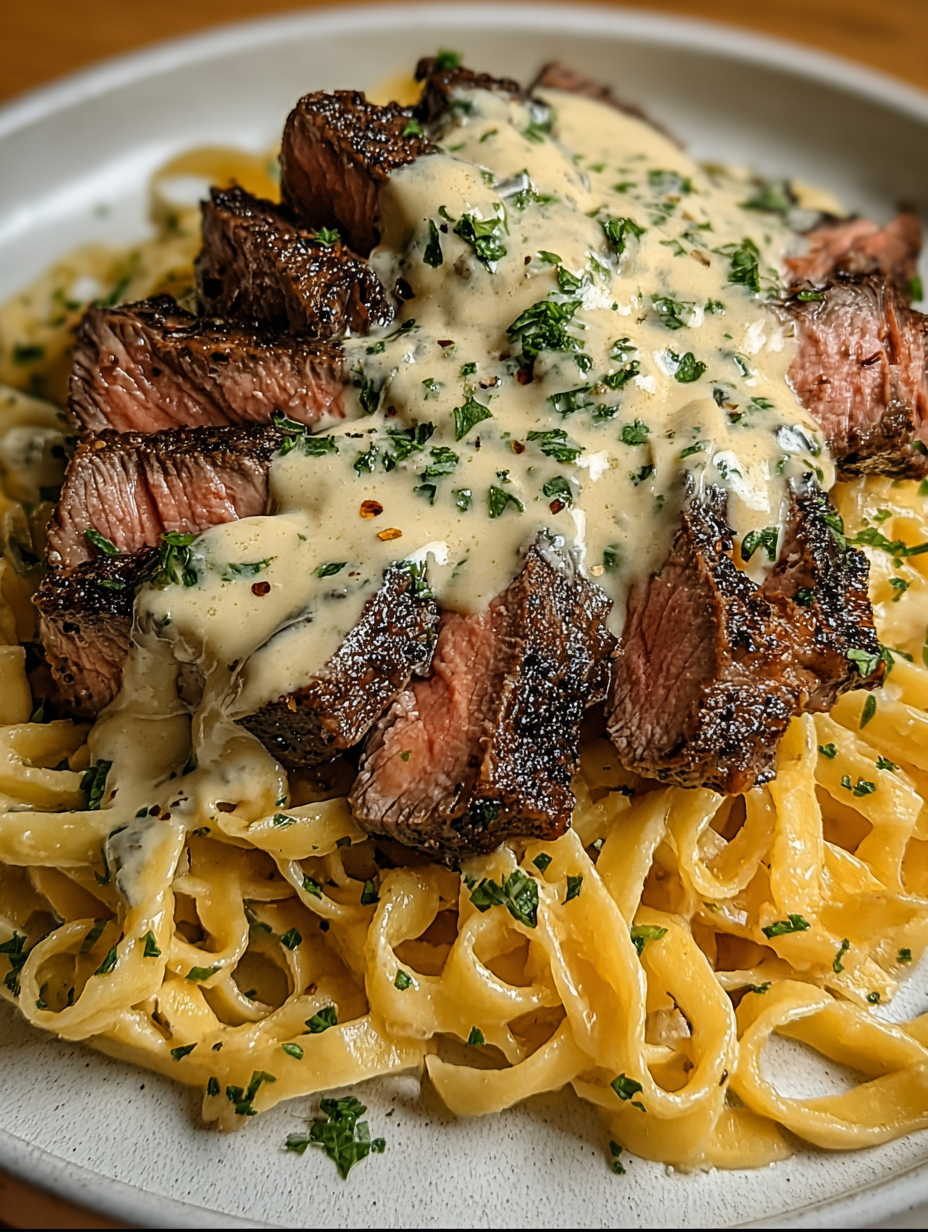 Pikantes Steak Gorgonzola Alfredo mit cremiger Parmesan-Soße