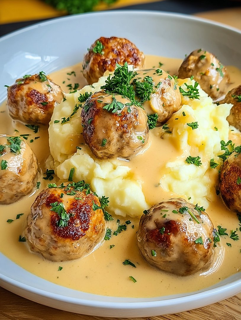 Hackbällchen in cremiger Sauce mit Kartoffelpüree – Ein herzhafter Genuss für die ganze Familie
