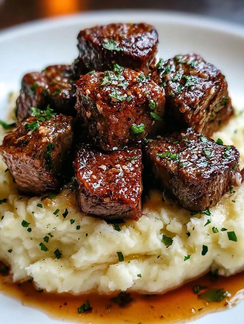 Knoblauchbutter-Rinderbissen mit Kartoffelpüree genießen!