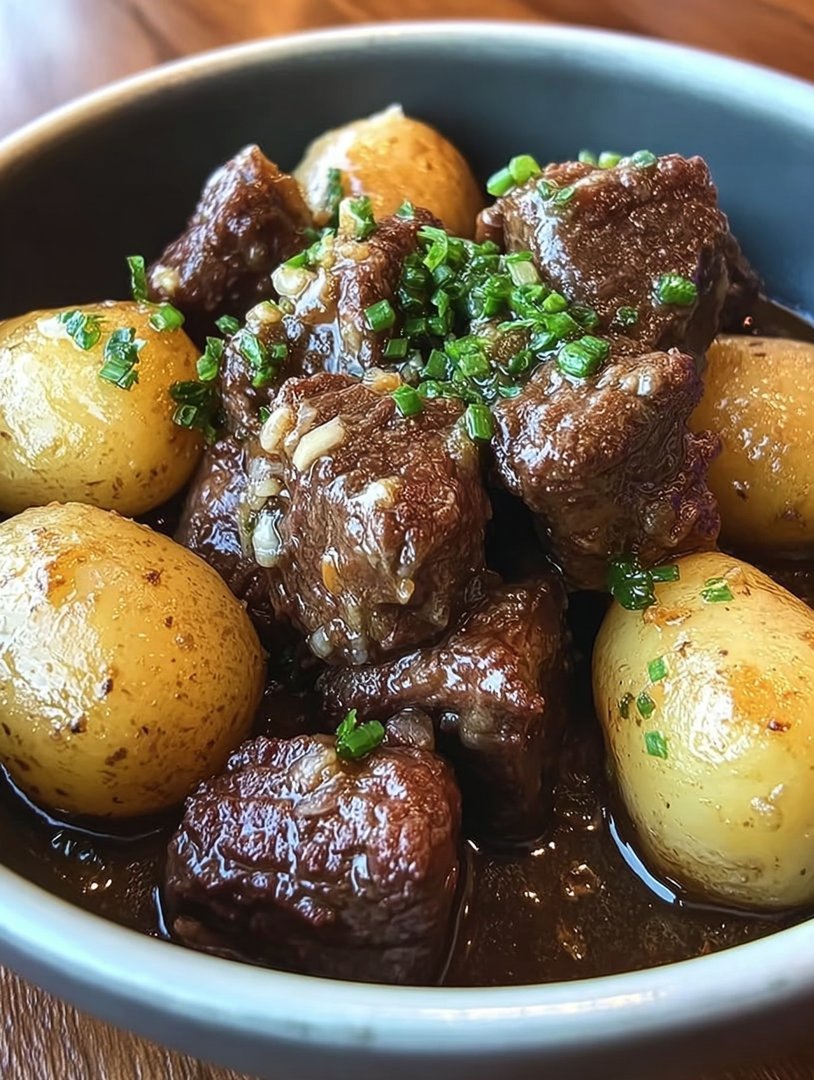 Rindfleischwürfel mit Knoblauchbutter und Kartoffeln