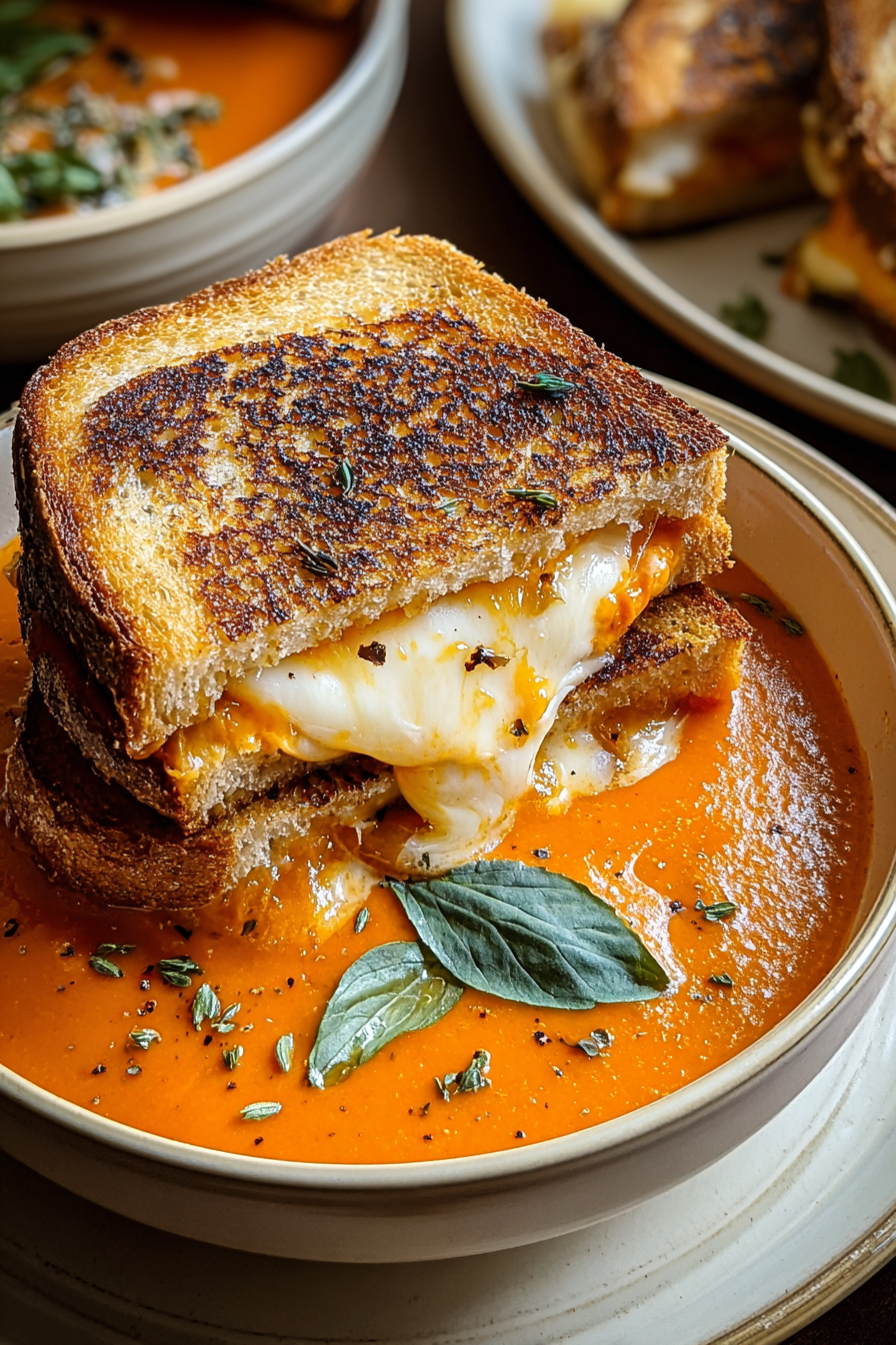 Geröstete Tomatensuppe und gegrilltes Käsebrot
