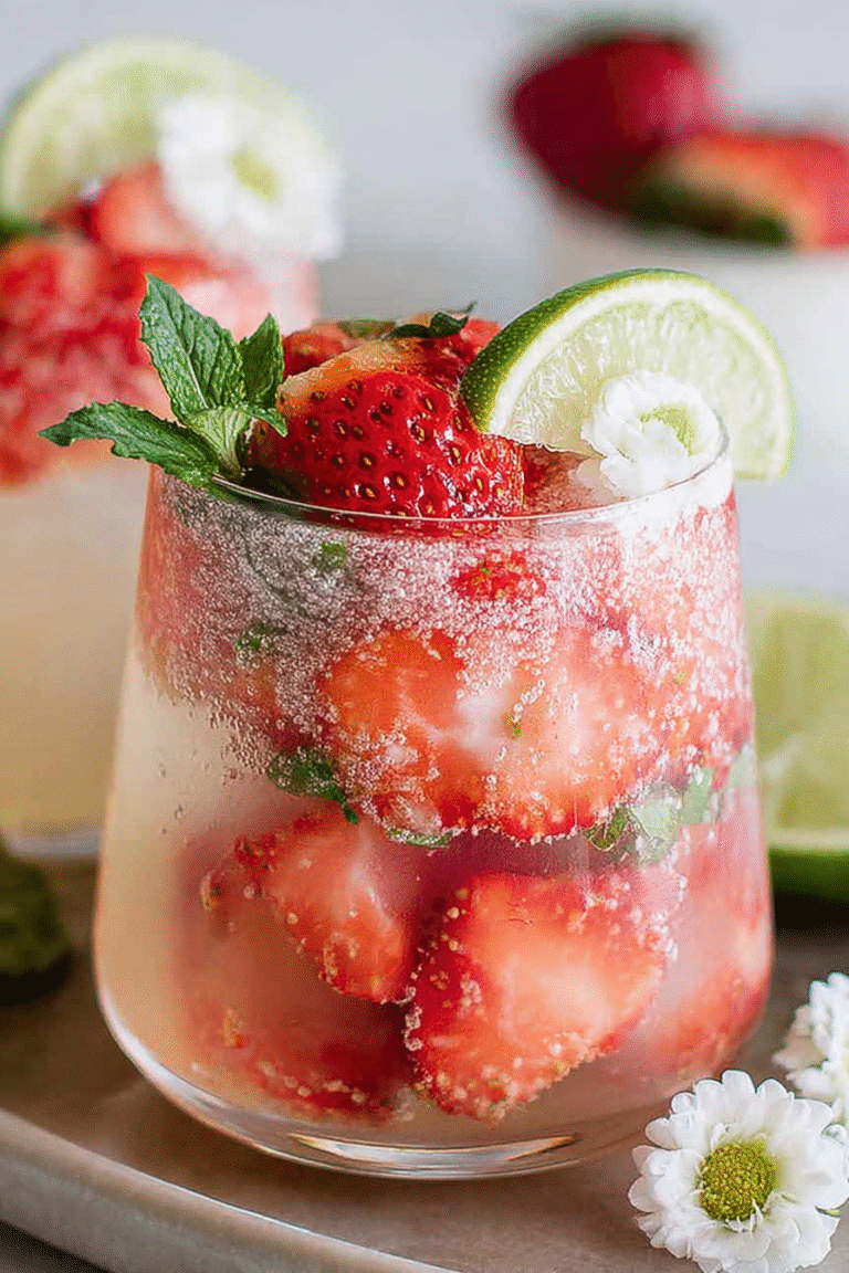 - Step 6: Mit einer Erdbeere und einem Minzzweig garnieren und sofort servieren.
