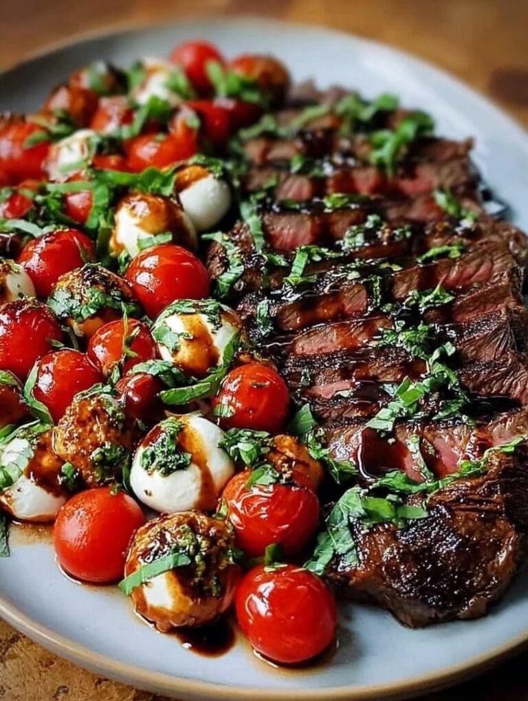 Zartes Flankensteak, perfekt medium-rare gegrillt, trifft auf cremigen Mini-Mozzarella, süße Kirschtomaten und ein intensives Balsamico-Dressing.