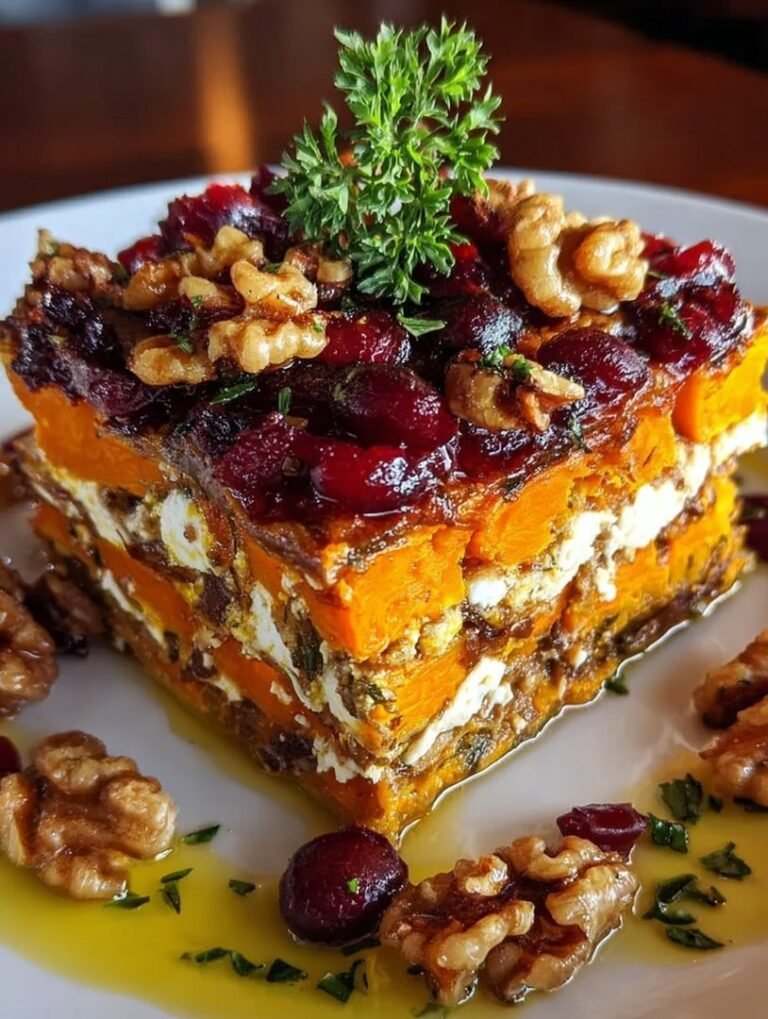 Wenn der Herbstwind pfeift und man etwas Besonderes braucht, dann ist dieseGeschichtete Lasagne aus Süßkartoffeln, Butternusskürbis und Karotten mit Feta, Walnüssen und Cranberry-Honig-Glasurdie Antwort. Sie ist warm, farbenfroh und schmeckt einfach göttlich, ein echter Seelentröster, der die Gemüter sofort erhellt. Vergessen Sie schwere Pastagerichte; diese Version ist leichtfüßig und dennoch sättigend. Sie werden staunen, wie gut geröstetes Gemüse, cremiger Feta und die süße Glasur aus Honig und Cranberrys harmonieren.