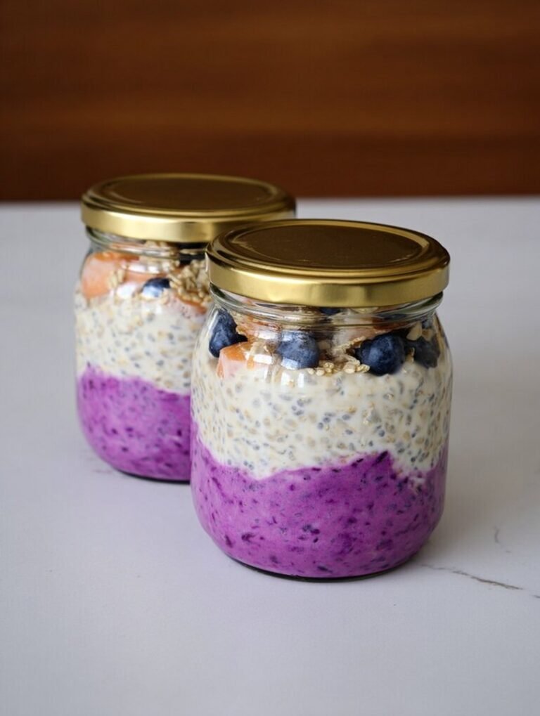 Du kannst die Overnight Oats auch in einem Glas schichtweise anrichten. Beginne mit einer Schicht Oats, dann eine Schicht Joghurt und eine Schicht Heidelbeeren. Wiederhole die Schichten, bis das Glas voll ist.