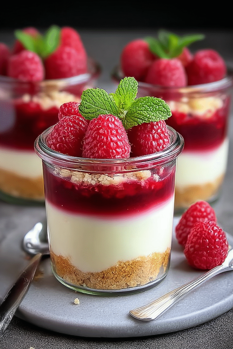 Und fertig! Dein Käsekuchen im Glas mit alkoholfreien Himbeerpüree ist bereit zum Genießen.