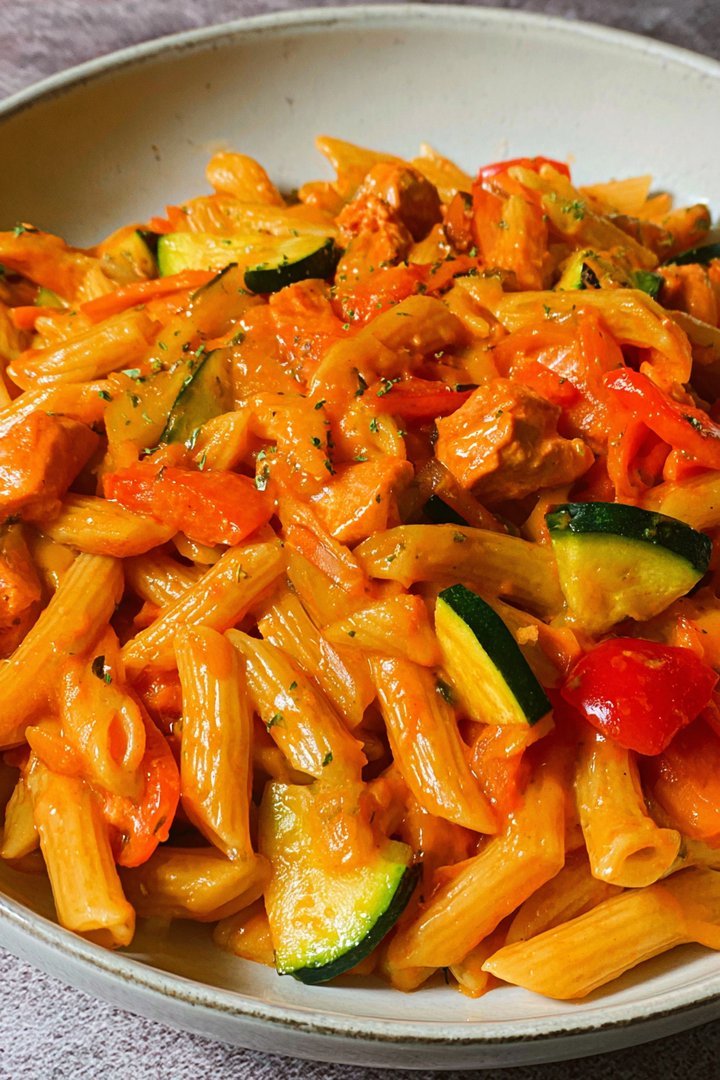 Eine einfache Mahlzeit, die mit frischem Gemüse und perfekt gekochten Nudeln gefüllt ist, wird Sie in eine Welt des Geschmacks entführen. Ideal für geschäftige Tage oder wenn Sie einfach nur etwas Gesundes und Leckeres genießen möchten!