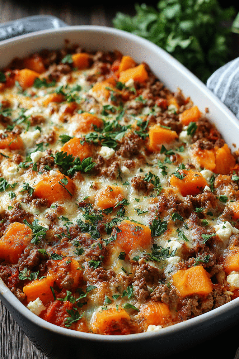 : Genießen Sie Ihren Süßkartoffel-Hackfleisch-Auflauf mit Feta!